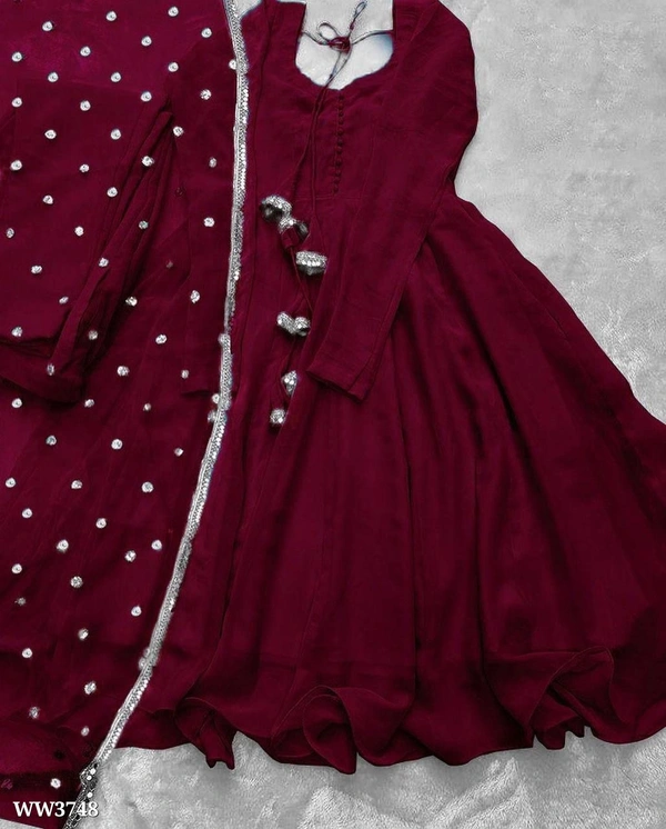🔸GOWN FABRIC :HAVY FOUX GOARGATE WITH HAVY RUFFLE WORK WITH FULL SLEEVES AND LATKAN