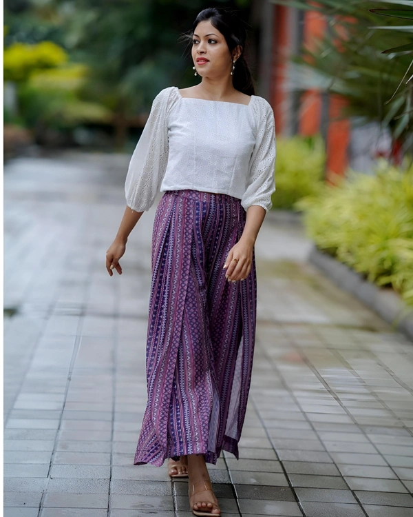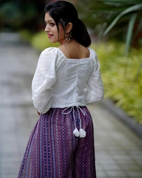 This stunning style plazoo pant vibrant colours printed with crochet sequence embroidery work and top
